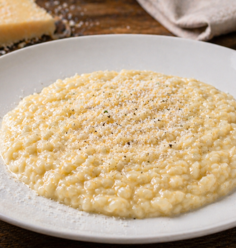 Il formaggio va aggiunto alla fine, dopo il burro, per evitare che fili e comprometta la cremosità del risotto. In questa fase è importante mescolare energicamente oppure mantecare “all’onda”, muovendo la pentola per creare la tipica consistenza morbida e avvolgente.